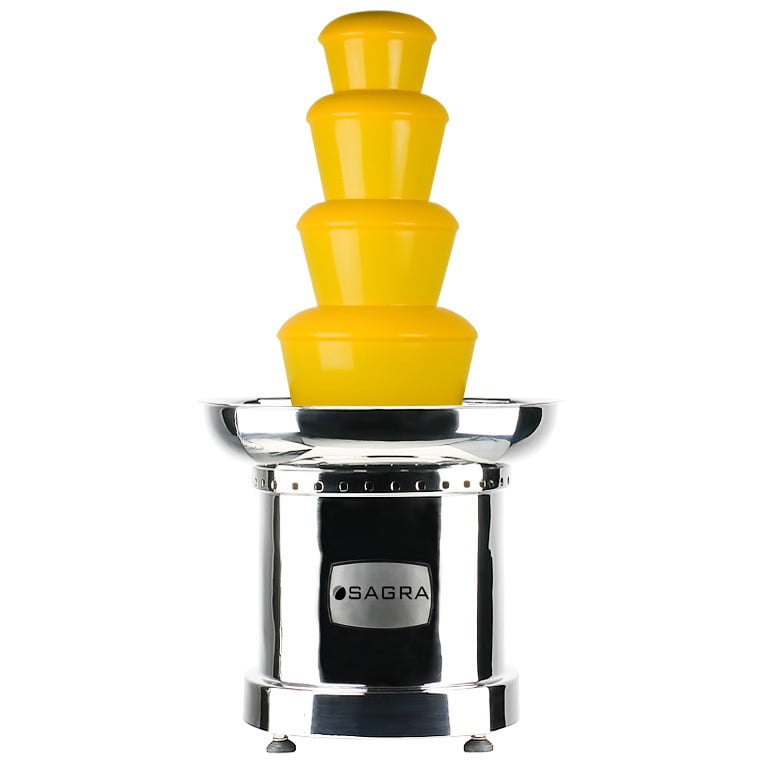 The new Sagra High-Temp Cheese Fountain is the only fountain designed to hold a variety of products above the crucial 135 degree level at the base of the fountain. This allows buffets and other establishments to run a variety of products (especially cheese) in the machine safely throughout the course of the day. The high-temp cheese fountain includes our removable bearing housing that allows for easy cleaning and bearing replacements. Add our custom wind guard to help hold the product at 135 or higher throughout the entire cheese fountain.